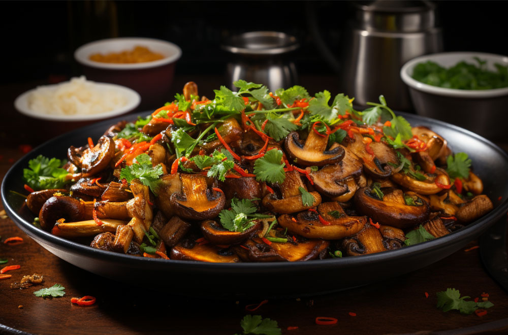 Mushrooms with rich schezwan kick.