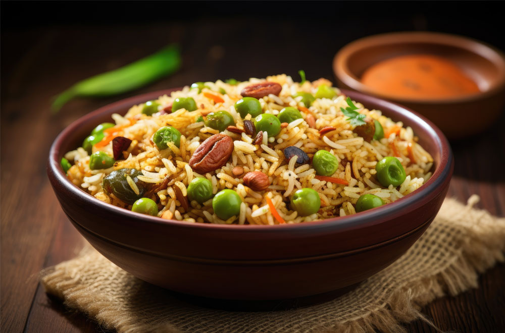 Golden cashews blended into mildly spiced biriyani.